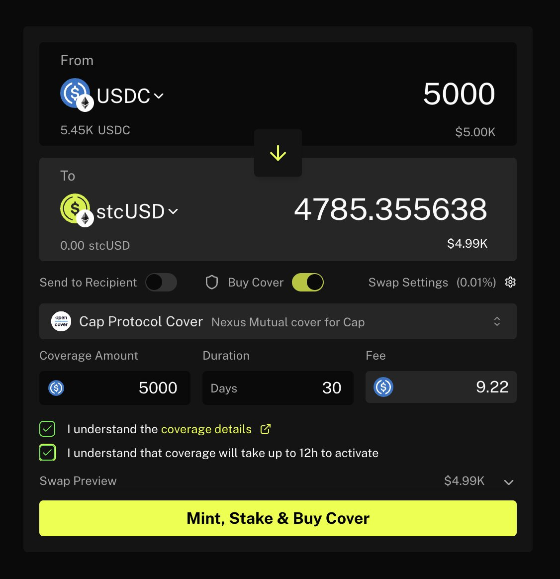Click “Mint, Stake & Buy Cover”